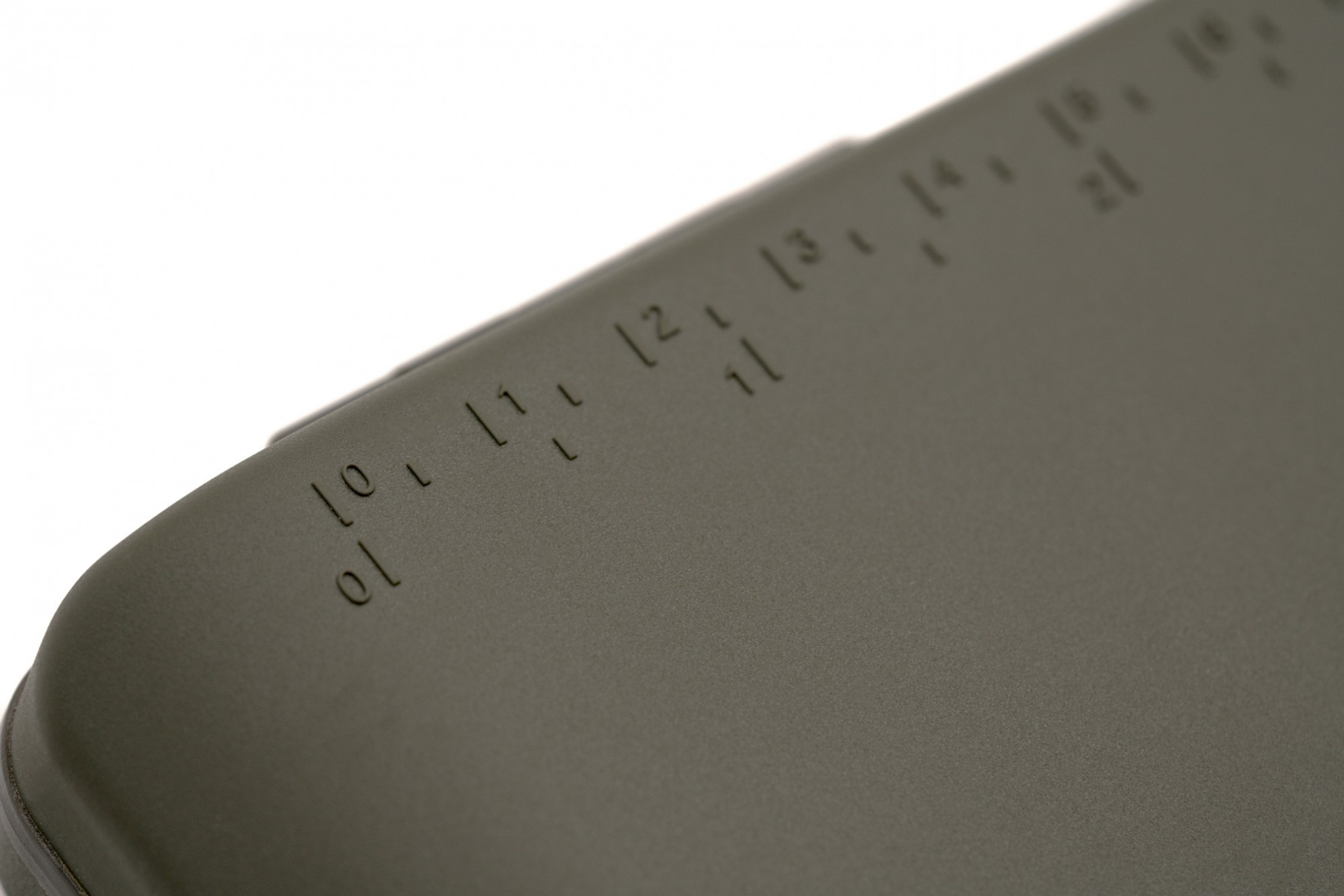 The Mini Rig Safe is a more compact version of the original Rig Safe, but will still hold 60 pre-tied rigs. The ridged aluminium bar is designed to keep your rigs in place during transit and the recess underneath ensures that your hook point can’t be accidentally damaged. The durable foam boards will take either single or double pins – supplied – to allow the storage of finished rigs with a swivel or loop at the end, or ones that are yet to be finished off and tied to the desired length. It is made from rigid plastic with a soft-touch rubber coating and a magnetic locking system to prevent it from opening during transit. It is roughly ten inches long and features a ruler on the outside to help you get your rigs the perfect length every time.
