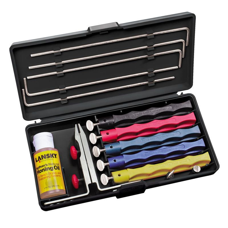 The ultimate in knife sharpening systems, safe, easy, and convenient to use. Deluxe Controlled-Angle Sharpening system with five hones, for precision knife sharpening, including Alumina Oxide and Ceramic Sharpening Hones. Includes: Sharpening hones on color-coated, finger-grooved safety holders Extra Coarse Sharpening Hone 70 grit Coarse Sharpening Hone 120 grit Medium Sharpening Hone 280 grit Fine Sharpening Hone 600 grit Extra Fine Sharpening Hone 1000 grit Precision-engineered, multi-angle, flip-over knife clamp One guide rod for each honing stone Specially formulated honing oil Extra long knife clamp screws Custom molded storage/carrying case to hold all system components