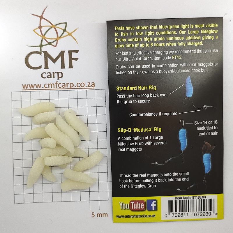 The Enterprise Niteglow Grubs Large Neon Blue is a Super soft buoyant imitation maggot in two sizes to use on the hook or hair rig. Tests have proven that blue/green light is most visible to fish in low light conditions. Our Niteglow grubs contains high grade luminous additive giving a glow time of up to 8 hours when fully charged. We recommend that you use our U. V. torch sold separately, for charging within 15 seconds. After the initial very bright glow, the grubs will continue to glow for several hours at a reduced level. We recommend recharging after 3-4 hours to maintain a good glow. Ideal where a slow sinking hook bait is required. When fish are taking on the drop. Can be used on their own or in conjunction with real maggots, to produce a popped up or critically balanced bait. Use the maggots as a kicker on you hook to close the eye of the hook. If fishing over bottom or popped up or critically balanced hook bait. Also useful where small fish are a nuisance, constantly tearing real maggots of the hook. Our imitation maggots work best when used with real maggots either as loose feed or in PVA bags. Insert the hook and slide around the bend to a position that leaves the hook bend clear. Resists the attention of nuisance species including crayfish.