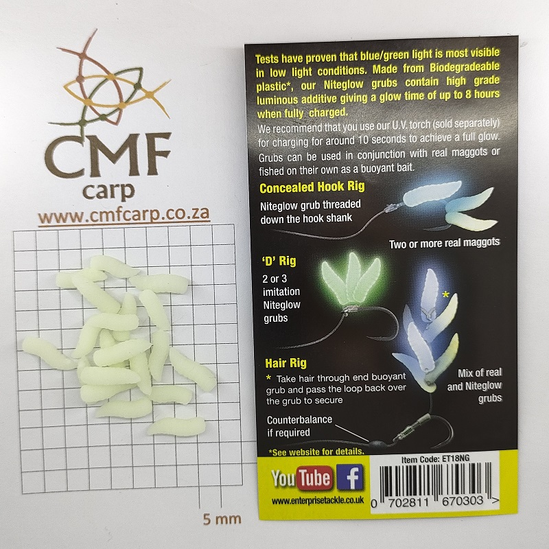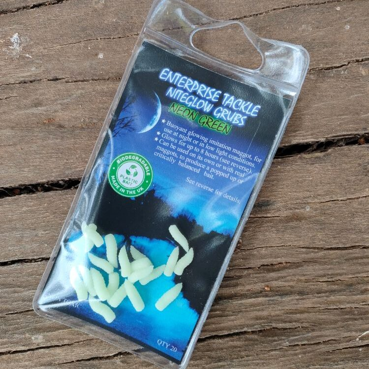 The Enterprise Niteglow Grubs Large Neon Blue is a Super soft buoyant imitation maggot in two sizes to use on the hook or hair rig. Tests have proven that blue/green light is most visible to fish in low light conditions. Our Niteglow grubs contains high grade luminous additive giving a glow time of up to 8 hours when fully charged. We recommend that you use our U. V. torch sold separately, for charging within 15 seconds. After the initial very bright glow, the grubs will continue to glow for several hours at a reduced level. We recommend recharging after 3-4 hours to maintain a good glow. Ideal where a slow sinking hook bait is required. When fish are taking on the drop. Can be used on their own or in conjunction with real maggots, to produce a popped up or critically balanced bait. Use the maggots as a kicker on you hook to close the eye of the hook. If fishing over bottom or popped up or critically balanced hook bait. Also useful where small fish are a nuisance, constantly tearing real maggots of the hook. Our imitation maggots work best when used with real maggots either as loose feed or in PVA bags. Insert the hook and slide around the bend to a position that leaves the hook bend clear. Resists the attention of nuisance species including crayfish.