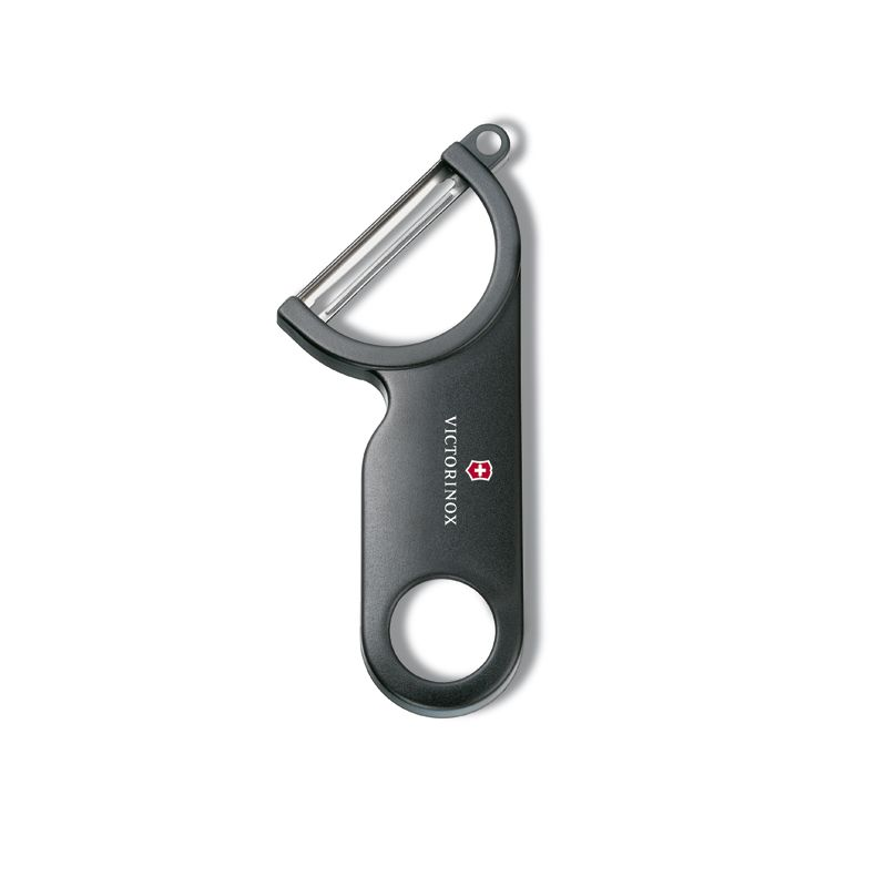 Makes effortless work of peeling, whether you are preparing potatoes, cucumbers, apples, or carrots, the Victorinox Potato Peeler allows one to easily remove the thinnest layer of peel, leaving behind the maximum possible volume of product to work with. Lightweight, ergonomic handle, single-edge razor-sharp stainless steel blade with a pivoting construction, and a clever removal tool for vegetable eyes and blemishes. For maximum ease of use, the peeler is dishwasher-safe. Height: 12 mm