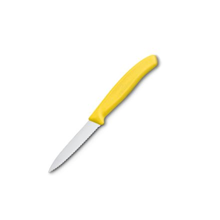 Ultra-sharp, small and agile, featuring a serrated edged blade with a pointed tip, delicate enough for intricate cuts and tough enough to smoothly slice through meats. Keep it close at hand to expertly cut, slice or finely dice fruit and vegetables. The ergonomic, anti-slip handle is designed for effortless working in the home or professional kitchen. Hand wash recommended, dishwasher safe. Key Features Swiss Classic Paring Knife Perfect For Cutting & Preparing Vegetables, Fruits & Other Nutritious Food Ultra-Sharp Serrated Edge Ergonomic Handle Pointed Blade Tip Warranty Victorinox warranty covers defects in materials and workmanship, however, excludes damage due to normal wear and tear and misuse